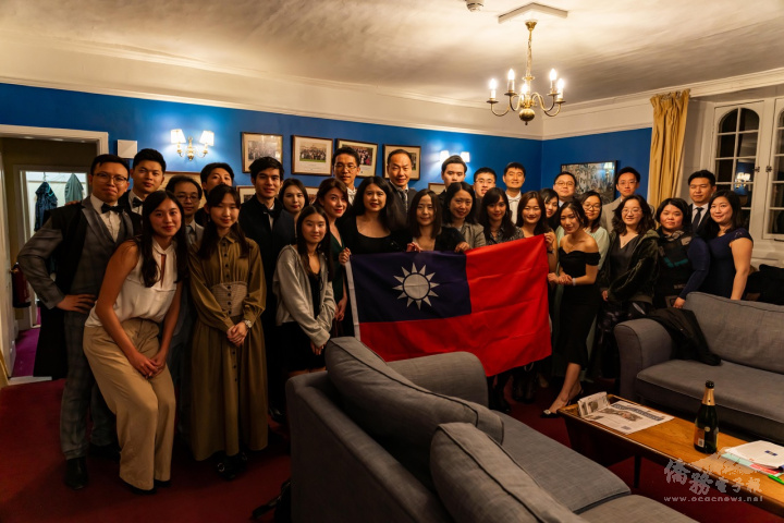 Group photo of members of The Council of Taiwanese Chambers of Commerce in Europe -Junior Chapter at an formal dinner at Exeter College of the University of Oxford.