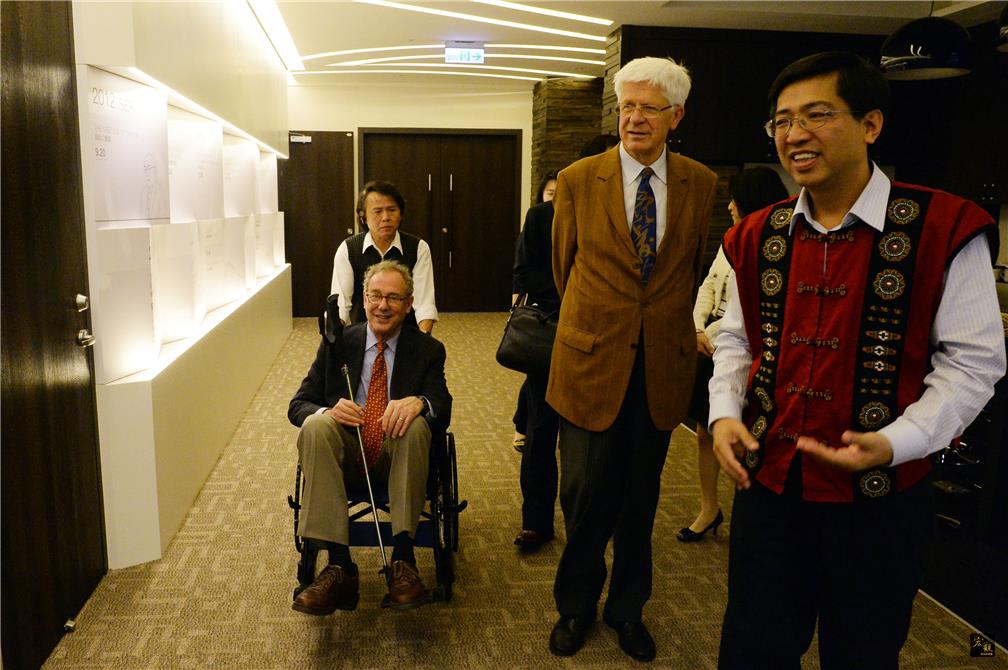 德國重量級法學學者史塔克(Christian Starck)(右二)與紐約哥倫比亞大學法學院教授李勃曼(Lance Liebman)(坐輪椅者)參訪唐獎基金會,基金會董事兼執行長陳振川(右)親自接待。(中央社提供)