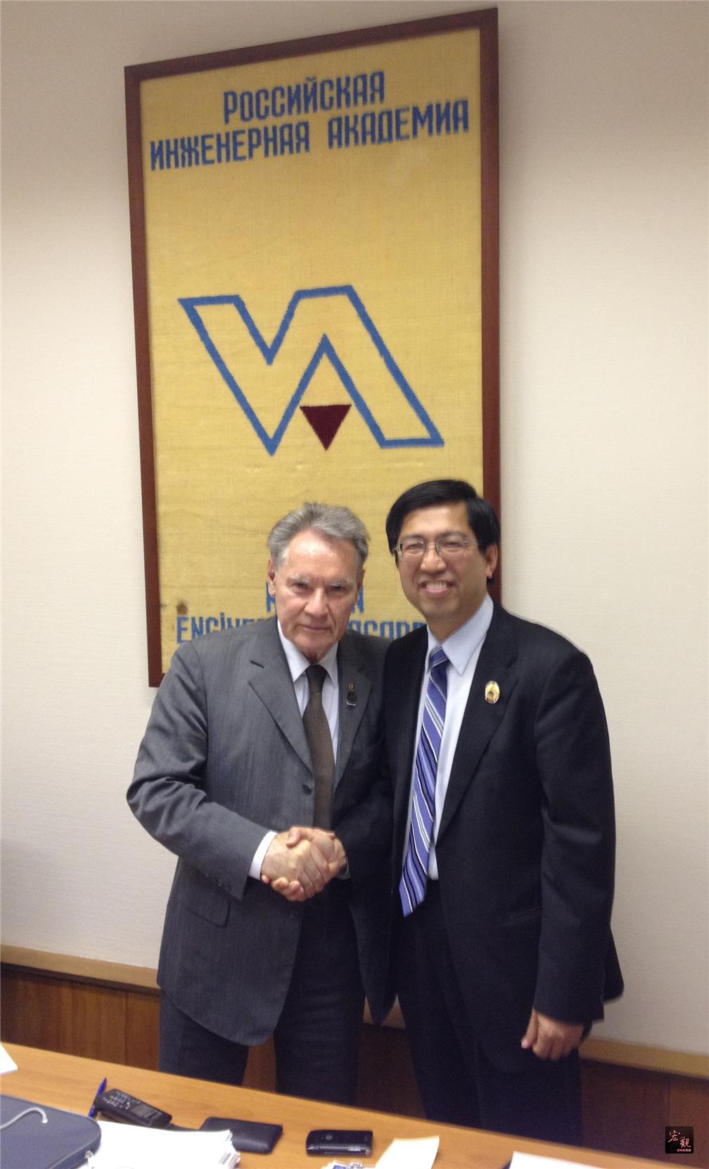 唐獎教育基金會執行長陳振川(右)14日拜訪俄羅斯工程院長古塞夫(Boris Vladimirovich Gusev)(左),感謝古賽夫協助宣傳唐獎。(中央社提供)
