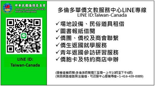 多倫多華僑文教服務中心LINE專線,提供加東地區僑民便利的聯繫管道,服務項目:包括場地設備、民俗道具租借;圖書報紙借閱;僑團、僑校及商會聯繫;僑生返國就學服務;青年返國參訪研習服務;僑胞卡及特約商店申辦。本中心服務轄區為:安大略省(Ontario)、緬尼托巴省(Manitoba)、諾瓦斯科西亞省(Nova Scotia)及愛德華王子島(Prince Edward Island)。