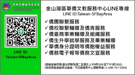 金山灣區華僑文教服務中心為提供北加州舊金山灣區、中加州斯郡、佛列斯諾及內華達州僑胞便捷快速且免費僑務諮詢服務,特設置本LINE帳號專線,以語言、圖文具影像等多元方式,讓僑胞可透過網路快速且無須支付電話費用方式獲得僑務諮詢服務。