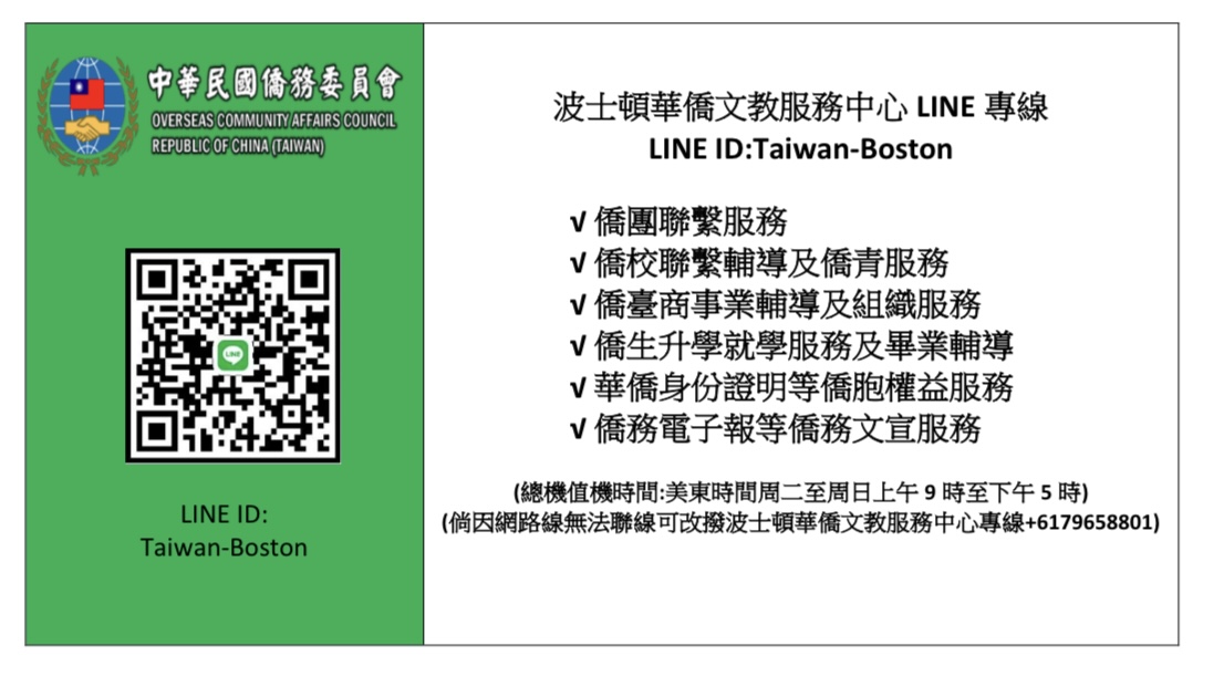 波士頓華僑文教服務中心為提供波士頓地區包括麻薩諸塞、新罕布夏、緬因、佛蒙特、羅德島等5州僑胞便捷快速且免費僑務諮詢服務,特設置本LINE帳號專線,以語言、圖文具影像等多元方式,讓僑胞鄉親可透過網路快速且無須支付電話費用方式獲得僑務諮詢服務。