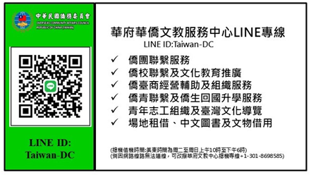 紐約華僑文教服務中心為提供美東地區紐約州、新澤西州、康乃狄克州及賓夕法尼亞州等4州僑胞便捷快速且免費僑務諮詢服務,特設置本LINE帳號專線,以語言、圖文具影像等多元方式,讓僑胞可跨越州際透過網路快速且無須支付電話費用方式獲得各項僑務服務。