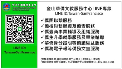 僑務委員會為提供舊金山市、屋崙、沙加緬度、市作頓及猶他州鹽湖城等地僑胞便捷快速且免費僑務諮詢服務,特設置本LINE帳號專線,以語言、圖文具影像等多元方式,讓僑胞可跨越國際透過網路快速且無須支付電話費用方式獲得僑務諮詢服務。