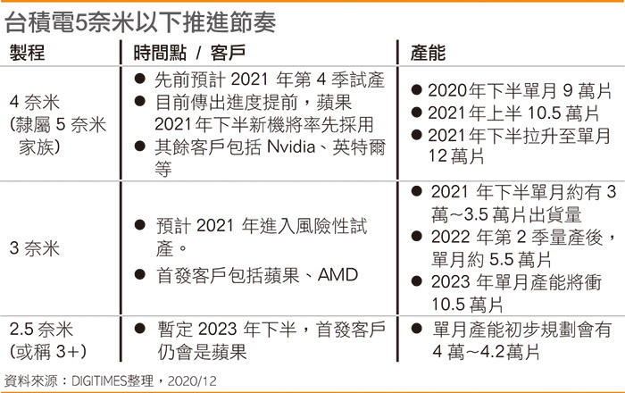 另值得注意的是,隸屬於5奈米家族的4奈米,先前預計2021年第4季試產,2022年量產,傳出進度提前,蘋果2021年下半新機將率先採用,除了蘋果外,4奈米製程客戶還有NVIDIA、英特爾(Intel)等。
