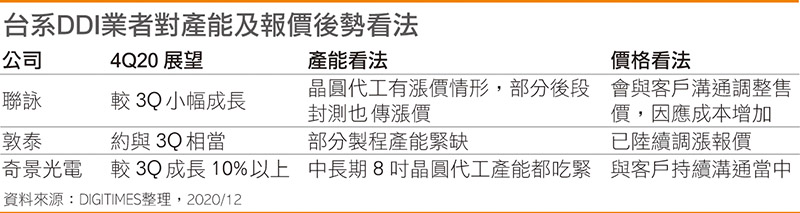 聯詠、敦泰及奇景光電在第4季法說會中,都齊一心志表達上游晶圓代工產能吃緊,這波供不應求缺口至少拉長至2021年第2季,對如何爭取上游晶圓代工廠的支持傷透腦筋。在晶圓代工報價短期看漲,加上後段封測產能也有意跟進的動作,這部分成本上漲的壓力將適度轉嫁出去。