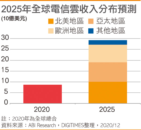 根據ABI Research最新發布的白皮書指出,預期到2025年全球電信雲營收將由2020年的87億美元成長至2025年的293億美元,年均複合成長率(CAGR)為27%;其中,預期北美電信雲市場規模將達100億美元,亞太地區約為90億美元,而歐洲地區則近82億美元。