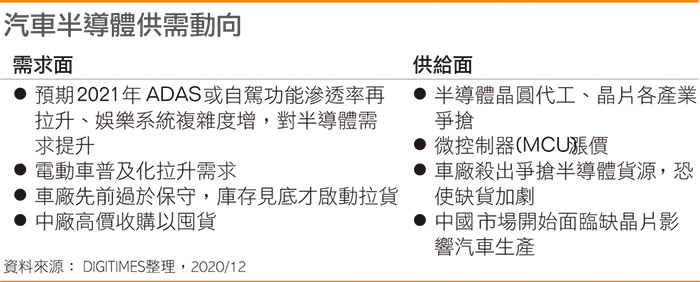 半導體缺貨使汽車產業更加焦慮,福斯汽車(Volkswagen)在中國的合資企業包括一汽大眾、上汽大眾12月因缺乏半導體晶片產能受波及。業者指出,預估2021年全球恐陷配給制,汽車原廠(OE)、一級代工廠(Tier 1)相對有優勢,其餘得各憑本事。