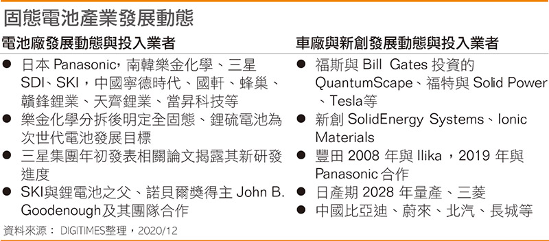 各國為積極減碳鼓勵新能源車(NEV)發展,電動車(EV)後續成長受到肯定,關鍵零組件鋰電池商機也跟著擴大,除了目前的主流電池,次世代的固態電池近期也頗受關注。豐田汽車(Toyota)計劃2021年推出相關技術、福斯汽車(Volkswagen)投資的QuantumScape近日也展示傲人成績,業界預估2025年左右固態電池將走向商業化。