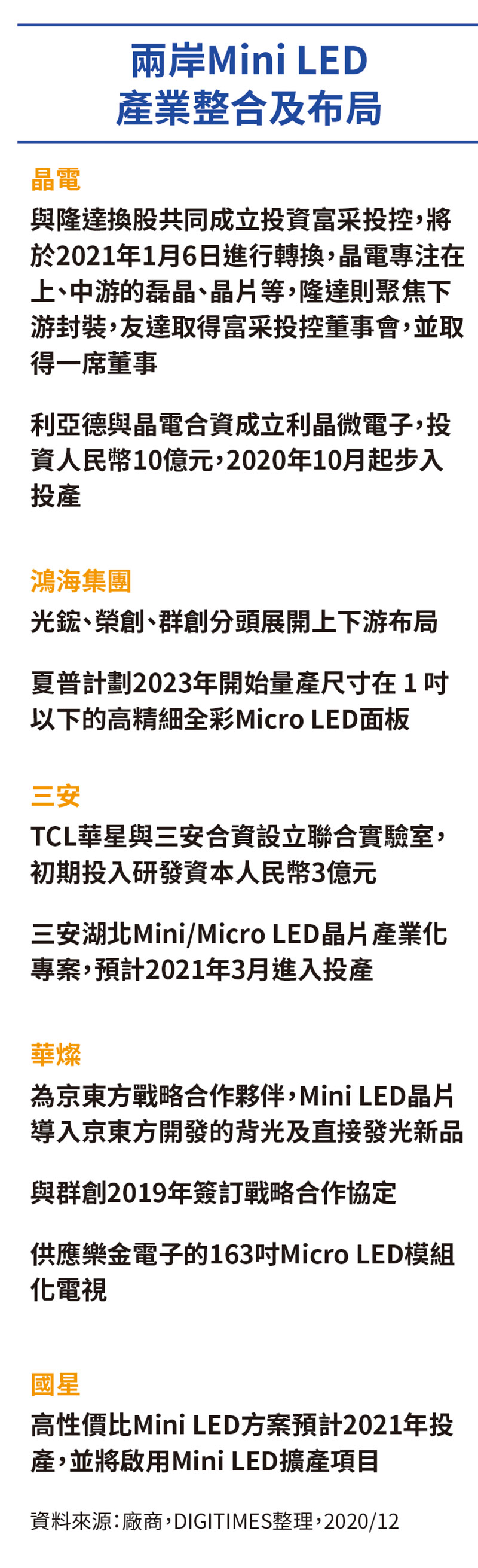 蘋果(Apple)將於2021年上半推出Mini LED背光的12.9吋iPad Pro產品,緊接著針對14吋及16吋的NB機種進行量產,在領導品牌帶頭導入下,2021年Mini LED應用可望進入爆發期;而電視龍頭廠三星電子(Samsung Electronics)也積極搶進Mini LED電視市場,並申請「Samsung Quantum Mini LED」商標,較勁OLED TV箭在弦上。因此無論是行動可攜裝置或大尺寸家用顯示器都即將進入Mini LED時代,在市場應用爆量成長之前,兩岸LED及面板業提前就位、各自結盟,未來隨著各家新機種的推出,Mini LED有望成為產業突圍的契機。