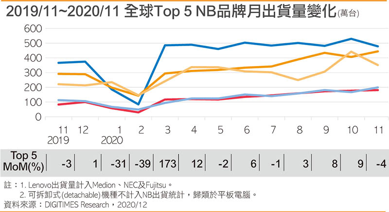 NB ODM普遍評估,在2020年第4季出貨衝高之後,2021年第1季出貨將衰退,不過並非訂單縮手,而是因為零組件缺料及農曆年長假因素。ODM評估,第1季出貨的季減幅度約為10~20%,不像往年動輒20~30%衰退,也凸顯第1季訂單暢旺程度。