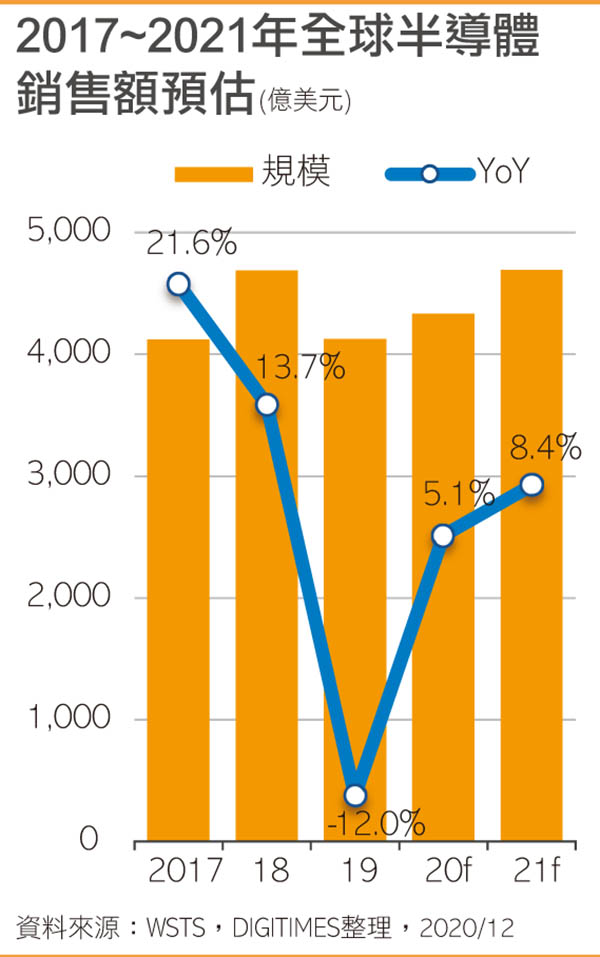此外,世界半導體貿易統計組織(WSTS)也於日前上調2020與2021年全球半導體銷售額預估。其中2020年銷售額為4,331.45億美元(年增5.1%),2021年為4,694.03億美元(年增8.4%)。